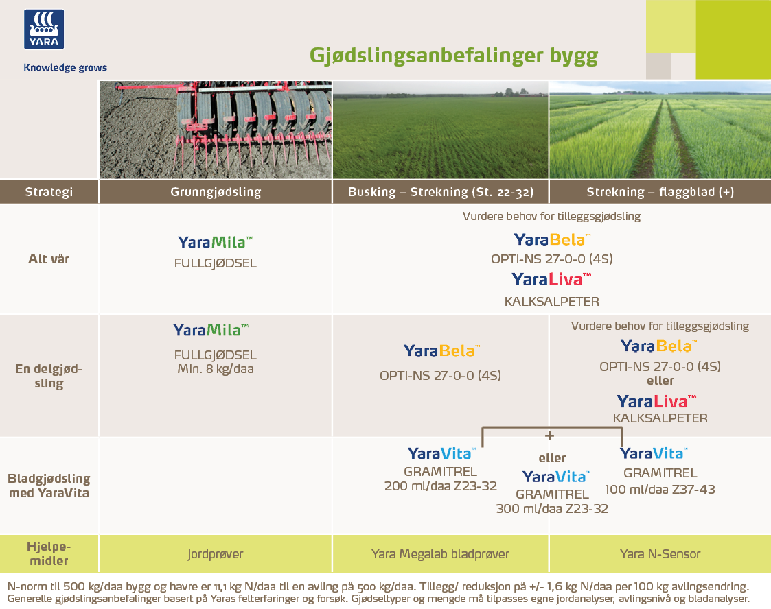 Bygg utvikler seg raskt og delgjødsling bør skje relativt tidlig. Mest aktuelle tidspunkt for planlagt delgjødsling er i perioden busking til begynnende stråstrekning (vekststadium 21-32).