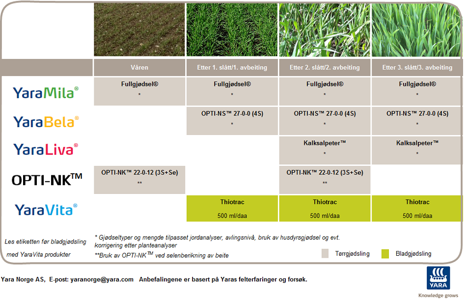 Yara anbefaler å tilføre relativt mye av total mengde mineralgjødsel om våren, 60 % i et toslåttsystem og 50 % av total gjødselmengde i et treslåttsystem. Utover sensommeren gir husdyrgjødsla bedre virkning, og jorda frigjør mere næringsstoffer fra jordbanken. Da er det kanskje fornuftig å holde igjen litt på mineralgjødselmengdene. Dette gjelder spesielt 3. slåtten, da det ofte kan bli høyt proteinnivå i fôret hvis graset slås på et ungt utviklingsstadium.