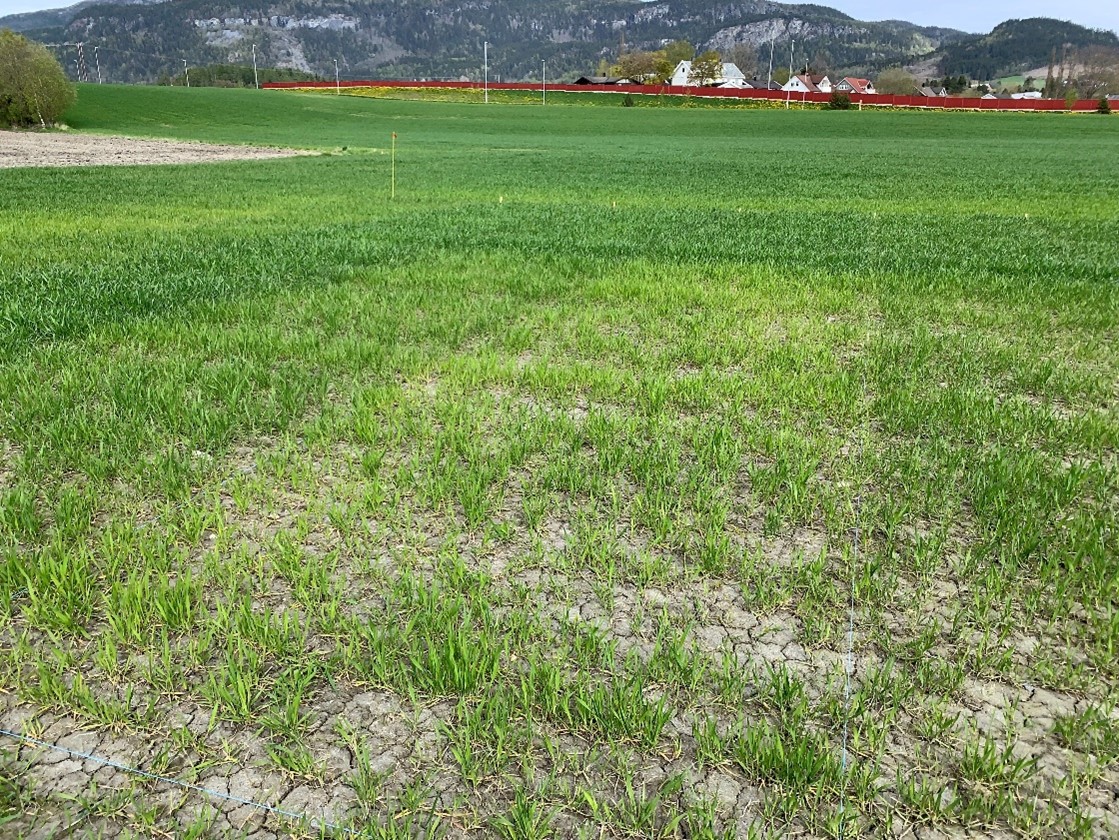 Felt 3. Nedbøren kom ikke jamn fordelt forrige uke, og Bernstein-åkeren i Kråkstad, Nordre Follo fikk kun noen få mm med regn siste uka. N-sensoren estimerer ingen opptak av nitrogen siste uka. Tørken parkerer plantene i både utvikling og næringsopptak, og det er behov for regn for å få plantene i vekst. Foto: Øyvind Akselsen.
