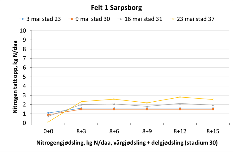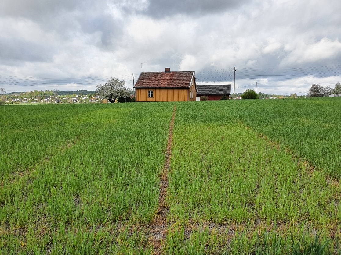 Felt 5. Julius-åkeren på Vormsund har på ny tatt opp ca. 0,5 kg N/daa siste uka. Plantene er i begynnelsen av strekkingsperioden og har tatt opp totalt 3,9 kg N/daa i overjordisk biomasse. Ugjødsla ruter har ikke endret seg siste uka, og opptaket ligger på 2,2 kg N/daa. Åkeren ser fin ut, og er ikke like preget av vannmangel som det andre feltet på Vormsund. Hvis området tildeles regn den kommende tida, har dette feltet et bra utgangspunkt for god vekst fremover. Foto: Morten Botilsrud.