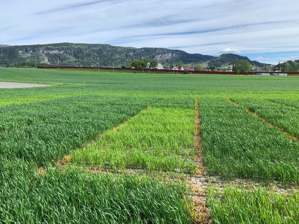 Felt 4. Kuban-åkeren på Vormsund har begynt strekkingsperioden og har kommet til vekststadium 32. Det er estimert et opptak på 0,5 kg N/daa siste uka på gjødsla ruter og ingen endring på ugjødsla ruter. Det er fortsatt små forskjeller i N-opptaket mellom ugjødsla og gjødsla ruter. Det er behov for mer regn videre i strekkingsperioden for den videre utviklingen av plantene. Foto: Morten Botilsrud.