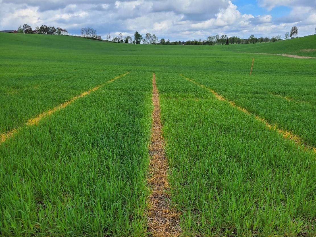 Felt 7. Høsthveten i Stjørdal utvikler seg fint, og har tatt opp rundt 2 kg N/daa siste uka. Det estimerte N-opptaket er nå på 4,5-4,9 kg N/daa. Plantene er på stadium 31, en leddknute synlig, og ble delgjødslet rett etter at målingene var gjennomført. Plantene har perioden med høyt næringsopptak foran seg, og alt tyder på at de vil utnytte delgjødslingen bra. Foto: Jon Olav Forbord.