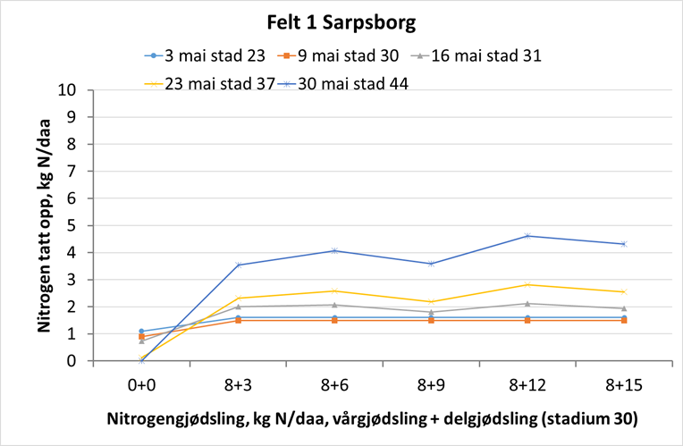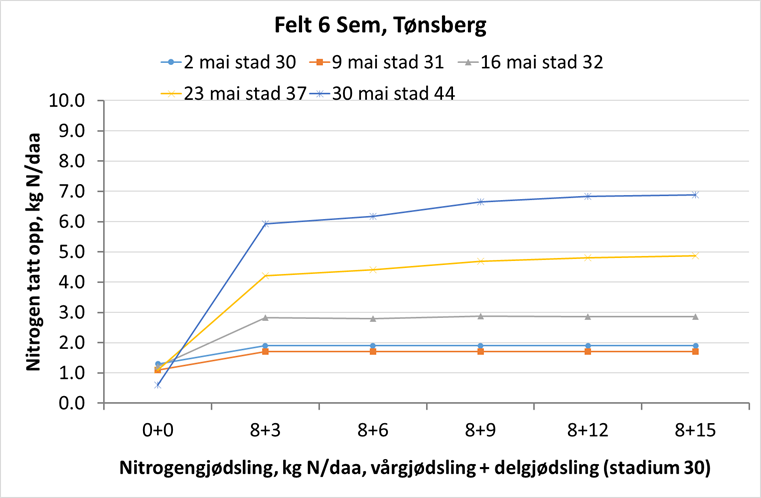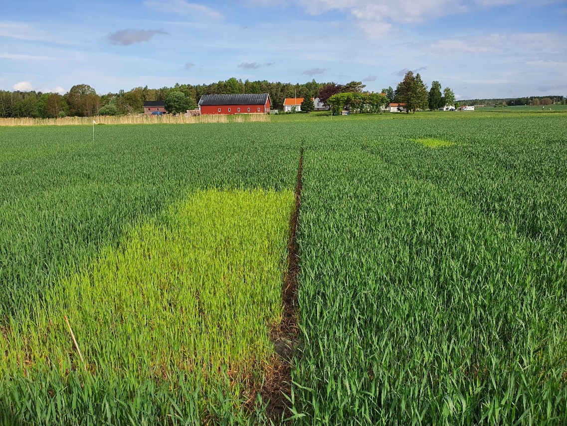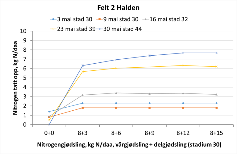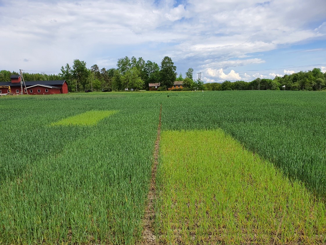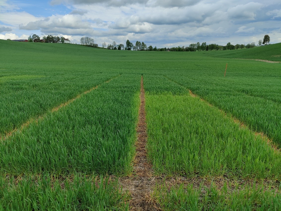 Felt 2. Bernstein-åkeren i Halden står best av de tre feltene sørøst for Oslo. N-opptaket økte med 1-1,5 kg N/daa den siste uka, og det er nå tatt opp rundt 7,5 kg N/daa i overjordisk biomasse. Plantene har kommet til vekststadium 44, holken sveller, og det går raskt mot aksskyting. Nullrutene viser fortsatt ikke noe opptak av N, men det skyldes i stor grad de dårlige vekstbetingelsene fra våren av, med mye tørke. Potensialet til disse ugjødsla plantene blir svært lavt og de klarer ikke å utnytte jordas N-leveranse utover sommeren. Under slike forhold klarer ikke nullrutene å gi et bilde på jordas N-mineralisering. Det er snart tida for siste delgjødsling på feltet, og en moderat gjødsling vil være fordelaktig for å øke proteininnholdet i kornet og også påvirke kornstørrelsen i positiv retning. Foto: Øyvind Akselsen.