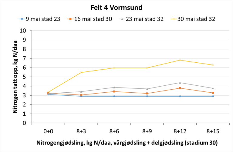Felt 4. Kuban-åkeren på Vormsund har hatt et høyt N-opptak siste uka. I overjordisk biomasse er det tatt opp 2-2,5 kg N/daa i opptak. Plantene er midt i strekkingsperioden, og utnytter både gjødsel og regnet godt. Selv om åkeren er noe preget av tørken, er potensialet fortsatt bra på denne åkeren. Det kjølige, regnfulle været som er noen dager nå, etterfulgt av mer sol og varme vil være svært gunstig for høsthveteplantene. Det er fortsatt litt tid til siste delgjødsling på dette feltet. Foto: Michael Aamold.