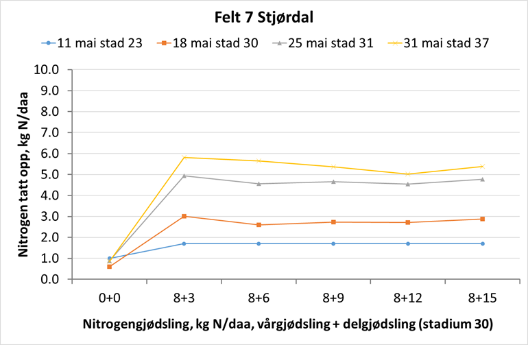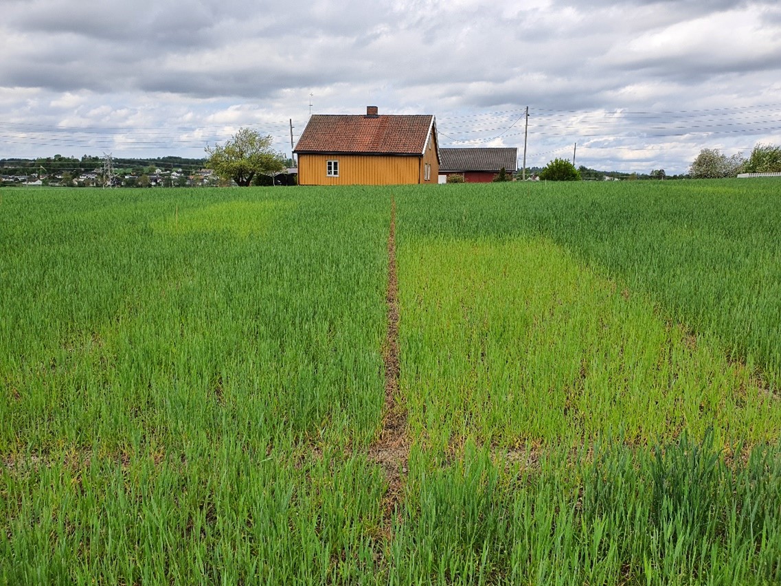 Feltene som fortsatt er i strekkingsperioden, ser ut til å ha klart seg best gjennom den langvarige tørken. Været vi har hatt de siste dagene, med relativt kjølige temperaturer og regnbyger nå og da har vært gunstig for alle felt. Det er gode forhold for rotutvikling og næringsopptak, og flere av åkerne viser et større nitrogenopptak den siste uka. I områdene som har vært hardest rammet av tørke, er plantene fortsatt sterkt preget av tørken. Her er avlingspotensialet varig redusert, og gjødslingen må tilpasse deretter.