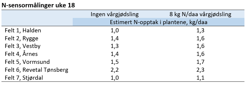 Så langt i vår har det vært et beskjedent opptak av nitrogen i overjordisk biomasse på samtlige felt. Opptaket ligger på 1,1 til 2,3 kg N/daa på gjødsla ruter, med høyest nitrogenopptak på feltet i Tønsberg. Foreløpig er det små forskjeller mellom ugjødsla og gjødsla ruter, både i målt N-opptak og visuelt i åkeren. Det er bra med fuktighet i jorda, og vårgjødsla har løst seg bra opp. Næringsopptaket vil stige med høyere lufttemperatur i dagene fremover.