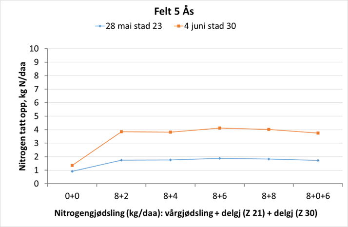 Bilde og figur 5. Feltet på Ås har tatt opp ca. 4 kg N/daa totalt i overjordisk biomasse frem til nå, og figuren viser en dobling i nitrogenopptaket fra forrige uke. På nullrutene er det tatt opp 1,4 kg N/daa. Feltet er ved begynnende strekking. Foto og målinger: Thor Olav Braathe.