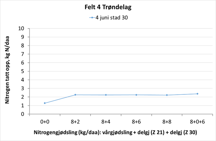 Forsøkene ble gjødslet med 8 kg N/daa på våren. Ved buskingsstadiet gjødsles det med enten 2, 4, 6 eller 8 kg N/daa. Noen av feltene kommet til busking og noen til starten av strekkingsperioden, z 30. Det vil bli gjennomført målinger frem til skyting.