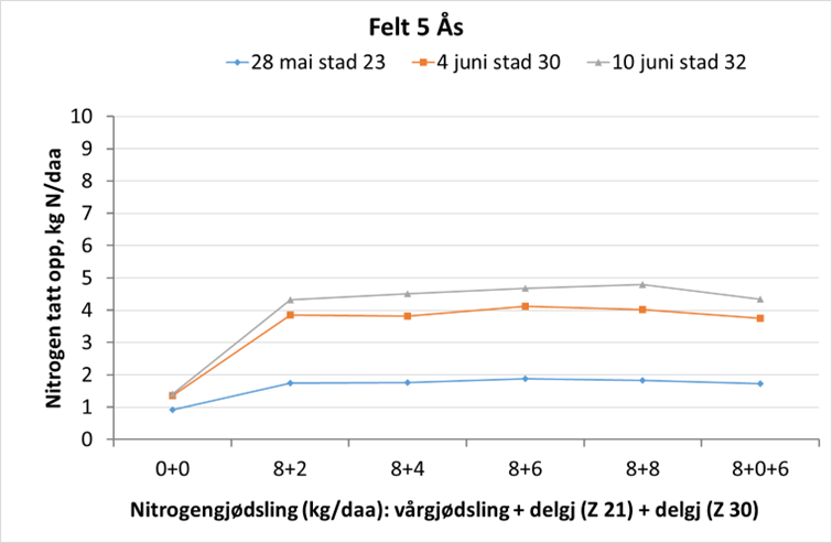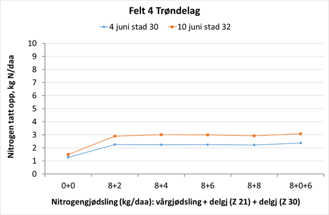 Foreløpig er det små forskjeller mellom de ulike gjødslingsleddene i nitrogenopptak. Det kjøligere været som råder om dagen, har senket utviklingshastigheten på kornet, og gjort at det får bedre tid til vekst og utvikling av aks, småaks og korn.
